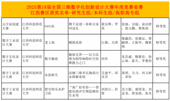 近日,从第18届全国三维数字化创新设计大赛(简称“全国3D大赛”)江西赛区组委会传来捷报,我校学子表现卓越。经过材料与能源学院和人工智能学院共同精心组织,师生团队激烈角逐,我校参赛团队共斩获省级特等奖5项、一等奖6项、二等奖15项、三等奖2项的优异成绩,获奖数量与质量均位居全省高校前列,充分彰显了我校在创新型应用人才培养和数字化设计教育方面的雄厚实力。